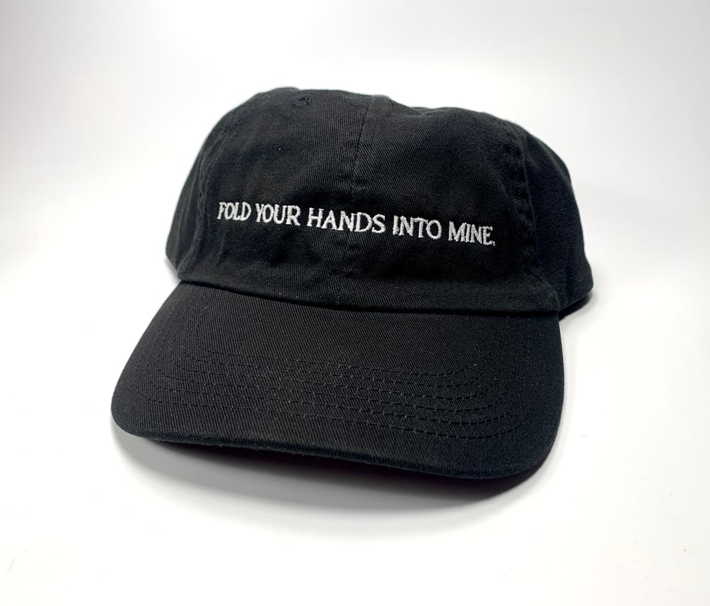 Black 6-panel unstructured hats (Dad Hat, or Baseball Cap style) with an adjustable strap on the back. These 100% washed cotton hats have white embroidery, sewn in the USA with the phrase: "Fold Your Hands Into Mine." across the front.